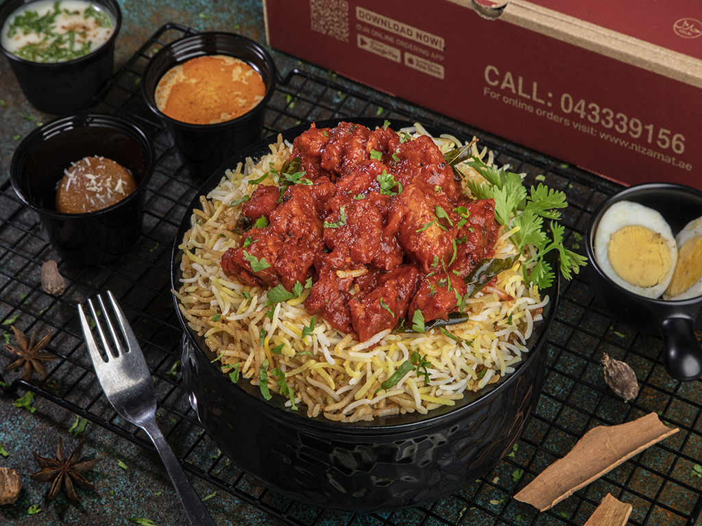 Cooked Dum rice layered with pieces of chicken 65, Serves with Mirchi Ka Salan & Raita ||| أرز دوم مطبوخ مع قطع دجاج 65، يقدم مع ميرشي كا سالان وريتا.