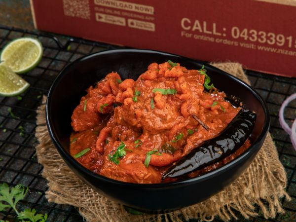 Prawns masala layered with basmati rice. Served with mirchi ka salan & Raita ||| روبيان ماسالا مع طبقات أرز بسمتي. يقدم مع ميرشي كا سالان وريتا.