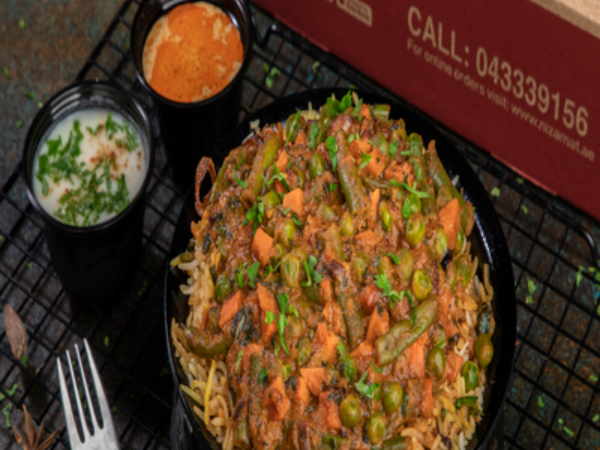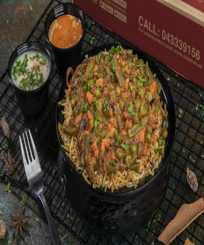Mix Vegetable Cooked With Saffron Dum Biryani Rice, Served With basmati rice, Mirchi Ka Salan & Raita ||| خضروات مشكلة مطبوخة مع أرز برياني بالزعفران، تقدم مع أرز بسمتي، ميرشي كا سالان وريتا