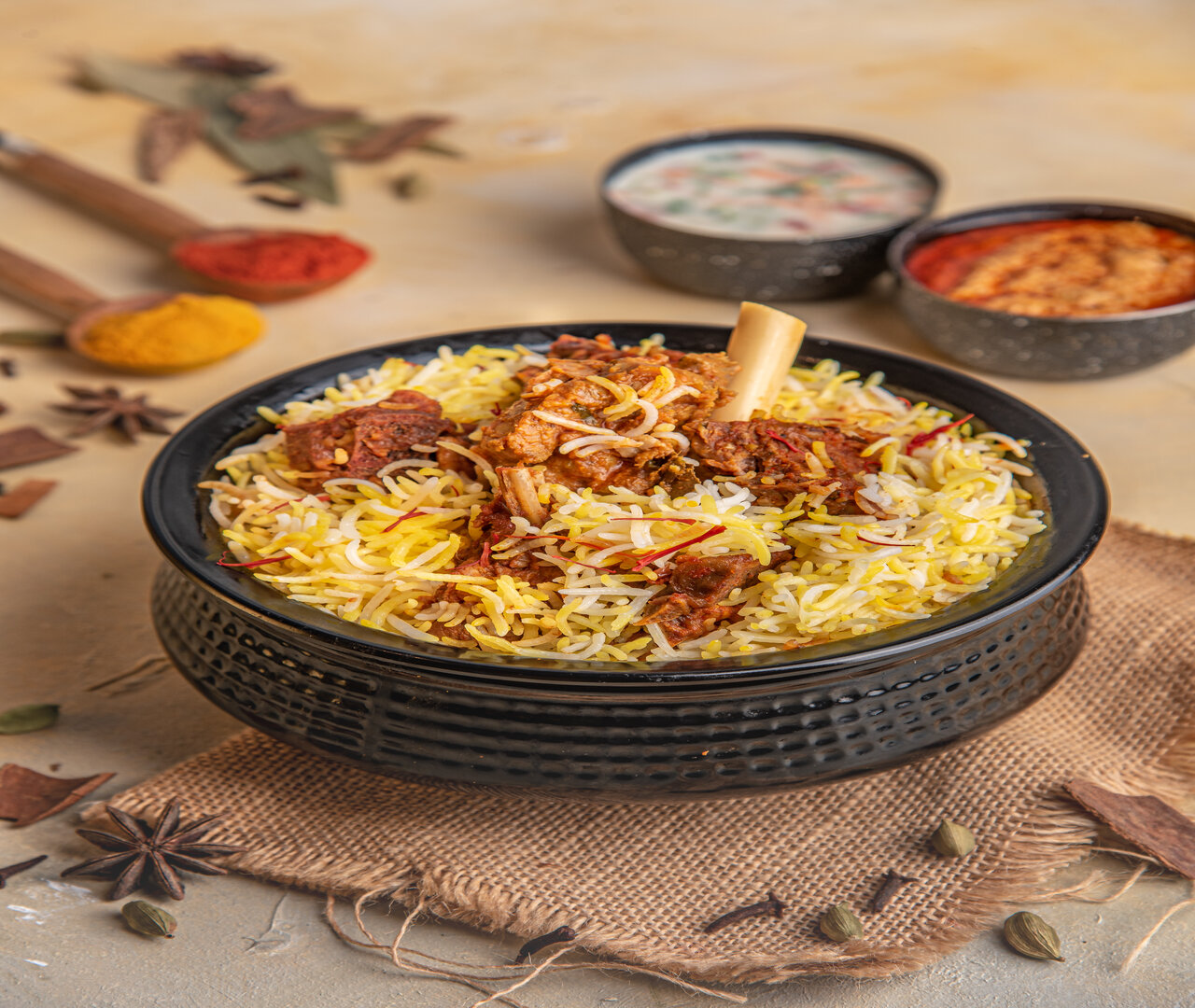 Authentic Hyderabadi Dum Biryani Made With Fresh Indian Mutton, Basmati Rice, Asli Ghee & Various Spices Which is Marinated Overnight. Cooked In A Handi Which Is Covered With A Lid And Sealed With Dough. ||| برياني حيدر أباد دوم الأصلي المصنوع من لحم الضأن الهندي الطازج والأرز البسمتي والسمن الأصلي والتوابل المختلفة المتبلة طوال الليل. مطبوخة في وعاء يدوي مغطى بغطاء ومختوم بالعجين.