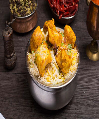 Authentic Hyderabadi Dum Biryani Made, With Fresh Chicken, Basmati Rice, Asli Ghee & Various Spices Which is Marinated Overnight. Cooked In A Handi Which Is Covered With A Lid And Sealed With Dough. ||| برياني حيدر أباد دوم الأصلي المصنوع من الدجاج الطازج والأرز البسمتي والسمن الأصلي والتوابل المختلفة المتبلة طوال الليل. مطبوخة في وعاء يدوي مغطى بغطاء ومختوم بالعجين.
